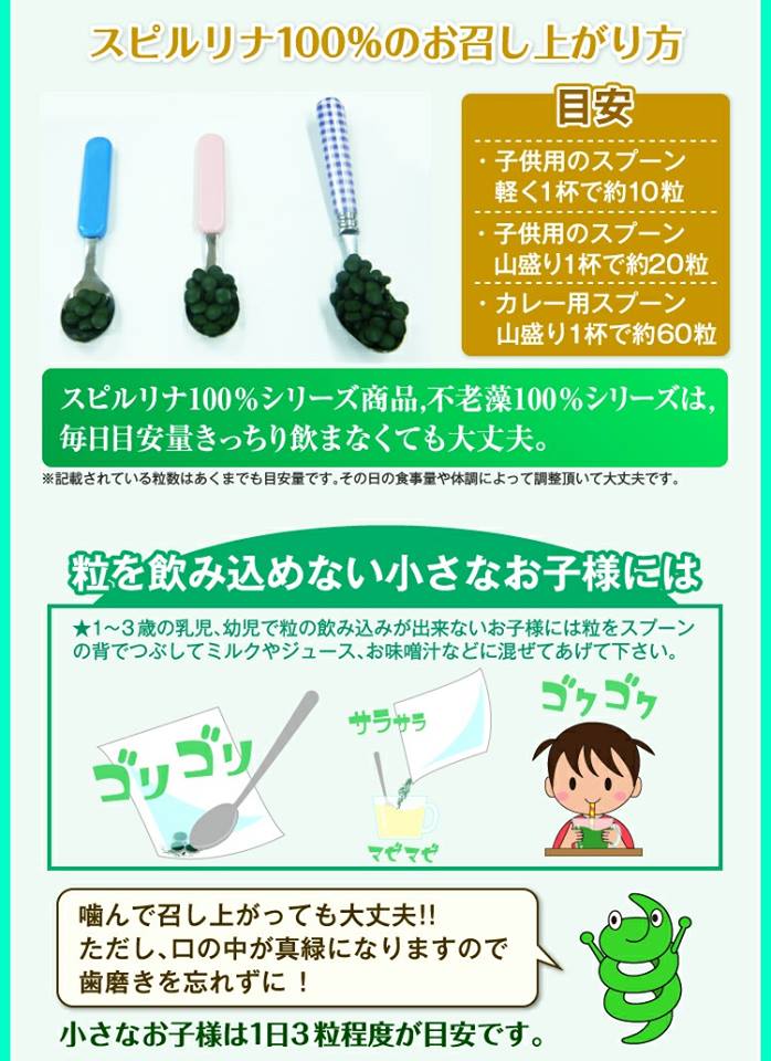Spirulina has a function which increases lactic bacterium and probiotic bacteria so we also recommend to take it with yoghurt and lactic acid bacteria beverage.