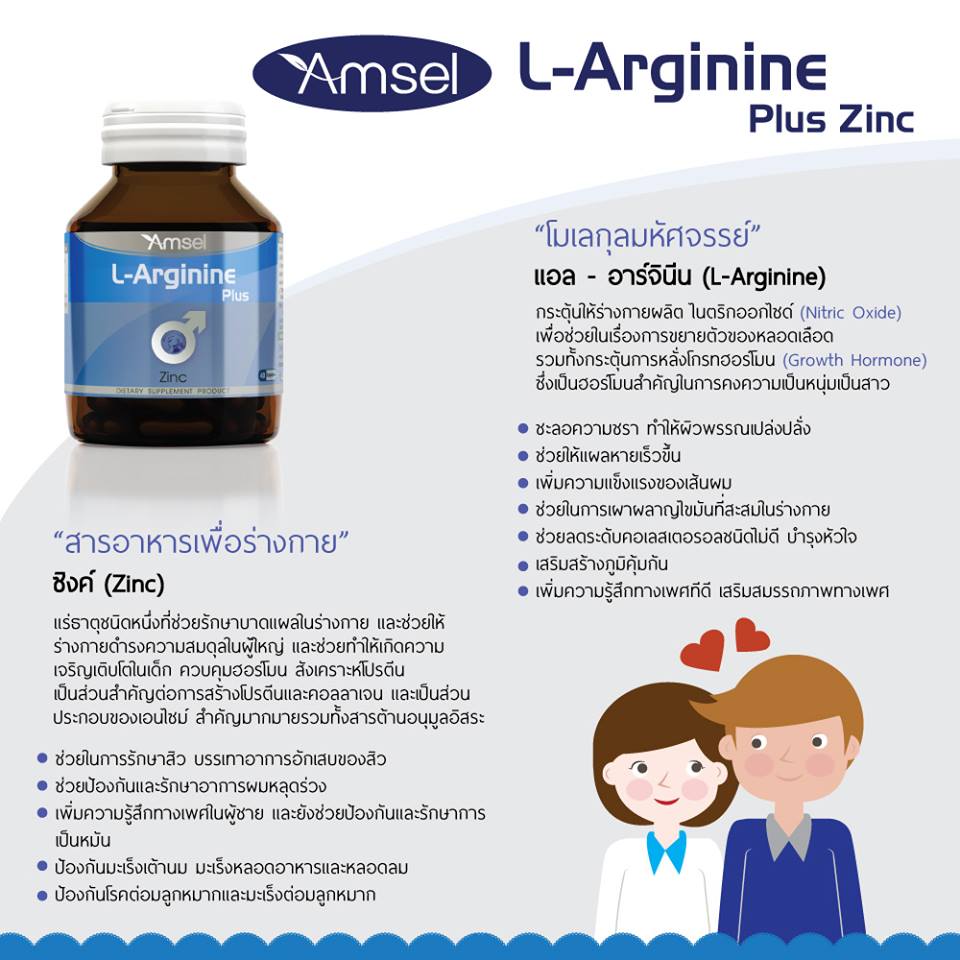 ผลิตภัณฑ์เสริมอาหารแอมเซล แอล-อาร์จินีน พลัส ซิงค์ มีส่วนประกอบของ แอล-อาร์จินีน (L-Arginine) +ช่วยในการขยายตัวของหลอดเลือด ทำให้เลือดไหลเวียนดียิ่งขึน +เสริมสมรรถภาพทงเพศ +เสริมสร้าง Growth Hormone ซิงค์ (Zinc) +ช่วยผลิตฮอร์โมนมากกว่า 200 ชนิด +เพิ่มจำนวนและความแข็งแรงของสเปิร์ม และช่วยให้ต่อมลูกหมากทำหน้าที่ได้ดี +ดูแลผิวพรรณและรักษาสิว แอล-อาร์จินีน เป็นกรดอะมิโน (Amino Acid) ที่ร่างกายต้องใช้สำหรับการสร้างโปรตีนทั่วร่างกาย พบมากในเนื้อแดง ไก่ ปลา ผลิตภัณฑ์จากนม ร่างกายสามารถสร้างกรดอะมิโนขึ้นเองได้เช่นกัน แต่เมื่ออายุมากขึ้นความสามารถของร่างกายในการผลิต กรดอะมิโนอาร์จีนีน จะน้อยลงเรื่อยๆ ตามวัยที่สูงขึ้น แอล-อาร์จินีน เมื่อเข้าสู่ร่างกายแล้วจะถูกเปลี่ยนเคมีชนิดหนึ่ง เรียกว่า ไนตริกอ๊อกไซด์ (Nitric Oxide) ซึ่งมีผลให้หลอดเลือดขยายตัว ช่วยให้เซลล์ในส่วนต่างๆ ของร่างกายได้รับ ออกซิเจน จากเลือดได้มากขึ้น แอล-อาร์จีนีน จึงช่วยบำรุงหลอดเลือดให้แข็งแรง โดยเฉพาะสุขภาพทางเพศสำหรับท่านชาย ช่วยแก้ปัญหาโรคหย่อนสมรรถภาพทางเพศ (Erectile Dysfunction) คือ ภาวะที่อวัยวะเพศไม่สามารถแข็งตัวได้อย่างเพียงพอหรือไม่นานพอที่จะมีเพศสัมพันธ์ สาเหตุหลักเกิดจากเลือดไปเลี้ยงอวัยวะเพศไม่เพียงพอ จึงแนะนำสำหรับผู้ที่มีปัญหาเรื่อง ภาวะหย่อนสมรรถภาพทางเพศ ที่วันละ 1,000-2,000 มิลลิกรัม นอกจากนี้ยังรับประทานเพื่อสุขภาพได้ทั้ง ชาย และหญิง ในปริมาณ 500 มิลลิกรัม (1 แคปซูล) โดยแอลอาร์จีนีนสามารถ -> ป้องกันการเกิดภาวะหัวใจทำงานล้มเหลว หรือหัวใจวาย (Congestive heart failure) -> ป้องกันอาการเจ็บหน้าอกจากหัวใจขาดเลือด (Angina) -> ภาวะหย่อนสมรรถภาพทางเพศ (Erectile Dysfunction | ED) และการมีบุตรยากในผู้ชาย -> ลดความดันโลหิตสูง -> ป้องกันโรคหลอดเลือดหัวใจตีบ (Coronary heart disease) -> ลดอาการภาวะกะเผลก (Intermittent claudication) หรืออาการปวดขา ปวดน่อง จนเดินกะเผลก และเมื่อพักแล้ว อาการปวด อาการกะเผลกจะดีขึ้น -> ช่วยเพิ่มสมรรถภาพ และพละกำลังให้กับนักกีฬา -> เสริมสร้างระบบภูมิคุ้มกัน (boosting the immune system) -> ป้องกันโรคไข้หวัด -> ช่วยให้แผลหายเร็วขึ้น -> ช่วยให้ระบบการไหลเวียนเลือดดีขึ้น -> กระตุ้นการหลั่งโกร๊ธฮอร์โมน (Stimulates the release of growth hormone) -> กระตุ้นการหลั่งอินซูนลิน(Insulin)*** ช่วยลดน้ำตาลในเลือด แอลอาร์จีนีนยังมีความปลอดภัยสูง สามารถทานได้ในปริมาณสูงถึงวันละ 5000 มก.(5 กรัม) ได้อย่างปลอดภัย ไม่มีผลข้างเคียง แอมเซล แอล-อาร์จินีน พลัส ซิงค์ Amsel L-Arginine Plus Zinc • กระตุ้นการหลั่งโกรทฮอร์โมน(Growth hormones) ช่วยให้ผิวพรรณสดใสขึ้น • กระตุ้นการทำงานของระบบภูมิคุ้มกัน • กระตุ้นการหลั่งของไนตริก อ๊อกไซด์ ช่วยให้